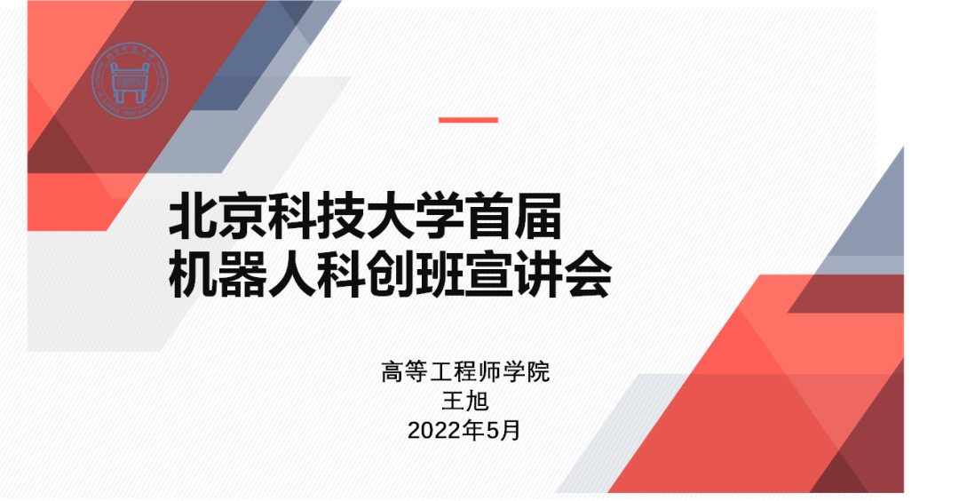 北京科技大学首届机器人科创班招生宣讲会于5月24日19:30分准时召开。本次宣讲会以线上会议的形式召开。主讲人是高等工程师学院机器人工程实践基地主任王旭研究员。来自机械,计通,自动化,高工等学院总计超过120名同学参加了宣讲会。