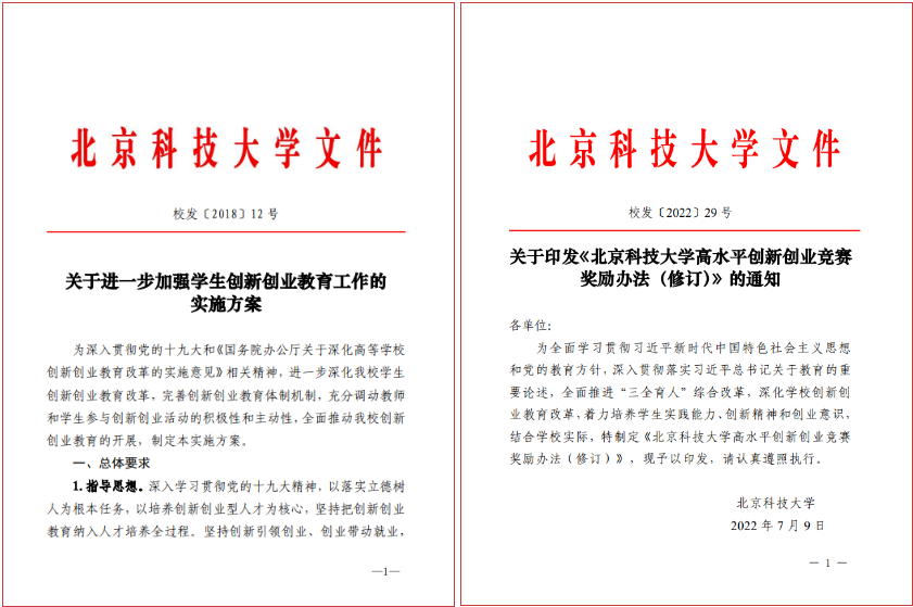 学校将深化创新创业教育改革作为“十三五”“十四五”发展规划、“双一流”建设重点内容,成立“创新创业教育工作领导小组”,完善机构设置,统筹推进创新创业工作。出台《关于进一步加强学生创新创业教育工作的实施方案》《高水平创新创业竞赛奖励办法》等政策保障性文件,将“培养创新创业意识和能力”纳入人才培养总目标,设置创新创业学分,推行“本科生全程导师制”,建设包括“创新创业实践基地”“贝壳创空间”“北科云创驿站”等在内的4600平米多功能双创基地综合体,汇聚全链条教育资源,推动创新创业教育融入人才培养全过程。