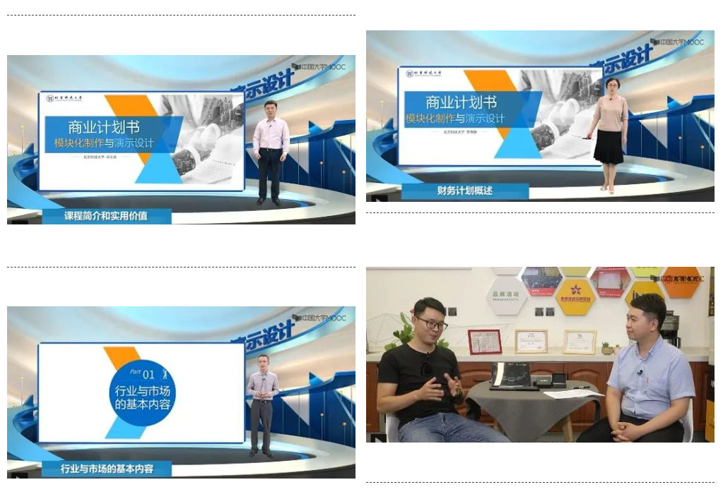 《商业计划书模块化制作与演示设计》线上课程主要包括商业计划书概述和制作前准备知识、商业计划书制作的四层次结构与十模块内容、商业计划书演示设计与路演答辩四环节和创业者访谈与复盘四部分核心内容。课程内容包括64个知识点、10个模块、16个金银奖案例、36个课堂研讨问题和16个工具方法。通过引导创业者和大学生了解商业计划书的本质,掌握商业计划书制作的原理和步骤,精通商业计划书的演示和沟通,从而达到“塑造商业计划思维、提升创新创业能力、培养创业精神和家国情怀”的教育目标。此外,课程组秉承立德树人的教学理念,将专业知识和课程思政有机统一,在讲授过程中,潜移默化地融入课程思政要素,激发学生的担当意识和家国情怀,培养创新创业精神,对树立正确的人生观和价值观起到引领作用。