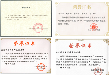 本课程内容已经获评“优秀创新创业课程奖”“北京高等学校优质本科课程”“北京高等学校优质本科教材”“北京市高等教育教学成果奖一等奖”“北京科技大学本科生优质课程”“北京科技大学素质教育核心课程”“北京科技大学课程思政特色示范课程”等荣誉,获教务处、创新创业中心支持的“北京科技大学第一批创新创业教育特色项目”。