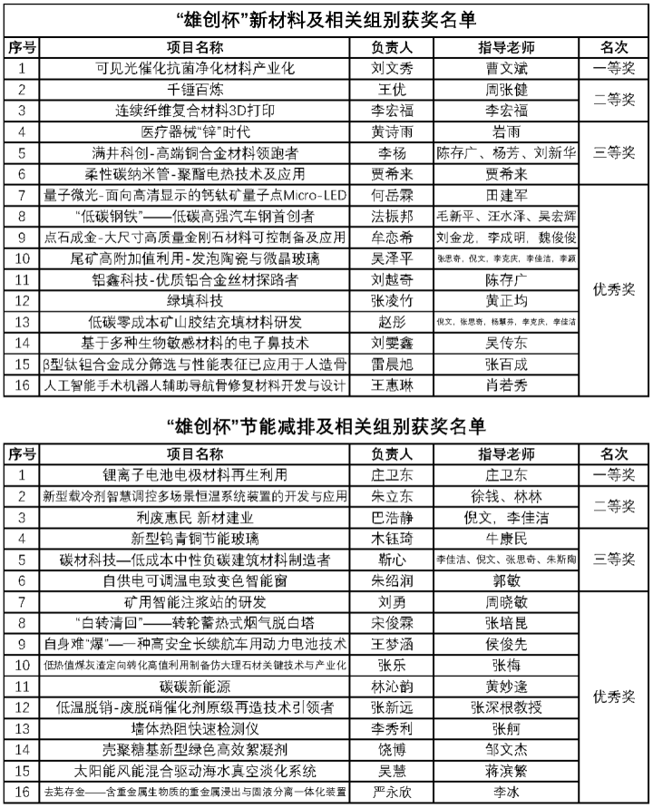 本届大赛分新材料、节能减排两组,初赛阶段共吸引43个团队、300余位同学踊跃参与。比赛准备阶段邀请知名商业顾问与创新创业导师、《创业地图》作者韩树杰为各个团队进行了商业计划书培训,邀请中国青年创业联盟中国青年创业导师巩佳伟为各个团队进行了路演答辩培训。决赛于2022年11月28日下午举办。最终,两组团队各荣获一等奖1支、二等奖2支、三等奖3支、优秀奖10支,具体获奖名单如下。决赛结束后,“中国创新创业大赛大中小企业融通赛雄安绿色数字产业专业赛”主赛加速营和优秀项目展示将会同步举行,帮助参赛师生充分了解华润、了解雄安,推动项目落地。